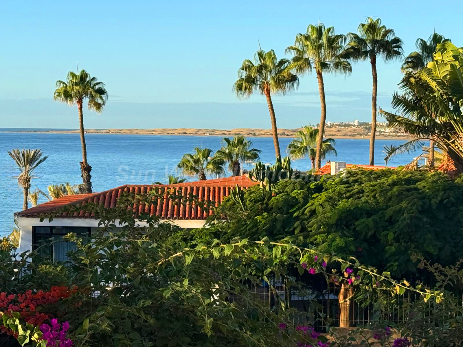 The living area is well laid out, filled with natural light, and features a practical sleeping area. The swivel-mounted LG Smart TV and the extendable sofa bed provide additional comfort. A particular highlight is the impressive view: from here, you can enjoy a wide panorama stretching over the dunes all the way to the Atlantic Ocean. This view can also be fully appreciated from the spacious balcony, surrounded by beautiful bougainvilleas—ideal for relaxing hours outdoors.
