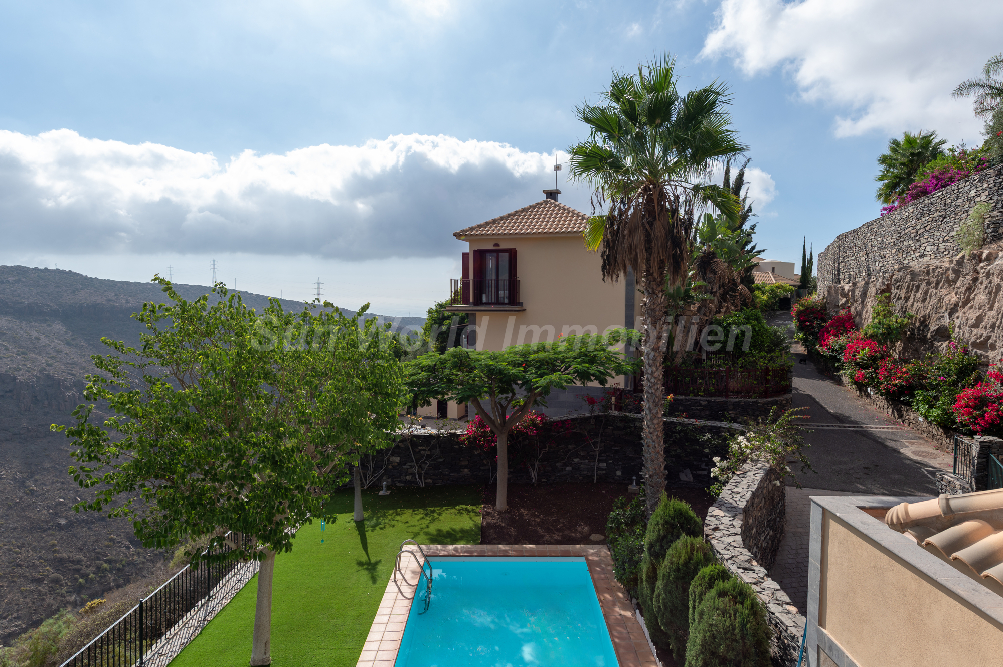 Im Hauptgeschoss befindet sich ein Wohnbereich mit Zugang zu einer umlaufenden Terrasse mit Blick über das Ayagaures-Tal bis nach Maspalomas. Angrenzend befinden sich ein separates Esszimmer, eine ausgestattete Küche sowie eine Außenwaschküche. Auf derselben Ebene liegen außerdem die Eingangshalle, ein Gäste-WC und ein Schlafzimmer mit eigenem Bad und Ankleide.
